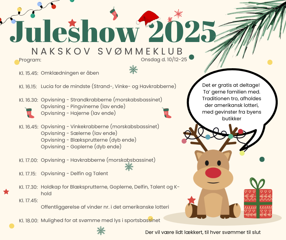 Alle svømmere og deres forældre, søskende eller andet familie er inviteret til Juleshow i Nakskov Svømmehal.